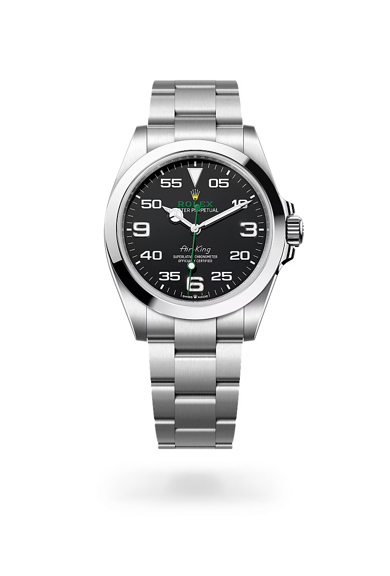 Like all Rolex watches, the Air-King is covered by the Superlative Chronometer certification. This designation testifies that every watch leaving the brand’s workshops has successfully undergone a series of tests conducted by Rolex in its own laboratories, according to its own criteria. The Superlative Chronometer status is symbolized by the green seal that comes with every Rolex watch and is coupled with an international five-year guarantee.