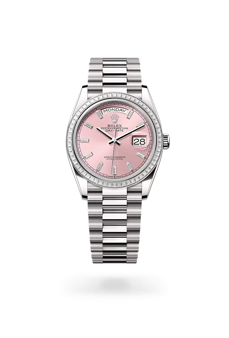 At its launch in 1956, the Day-Date was a major innovation: it was the first calendar wristwatch to indicate, in addition to the date, the day of the week spelt out in full in an arc-shaped window at 12 o’clock on the dial – a technical feat at the time. Made exclusively of precious metals – 18 ct yellow, white or Everose gold or 950 platinum – and accompanied by its emblematic President bracelet, its multiple dials make it the ideal canvas for self-expression.