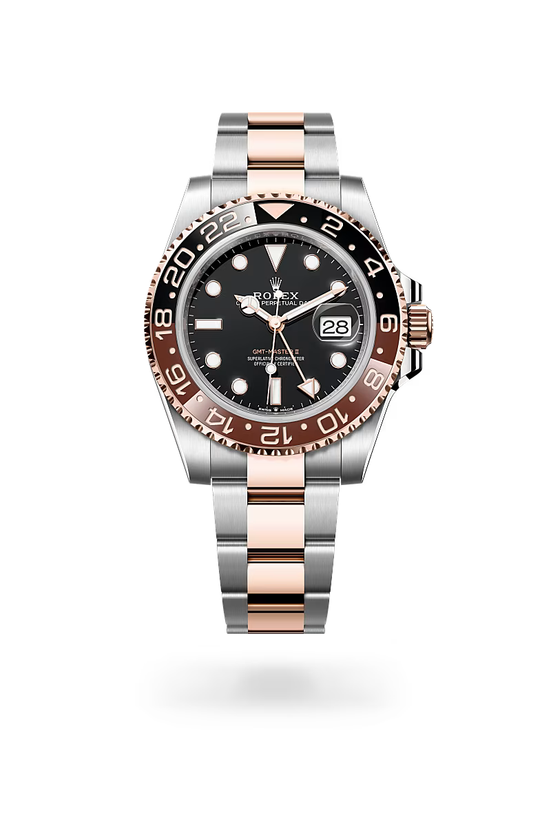 A two-tone Rolex GMT-Master II watch with a black dial and date displayed at 3 oclock.
