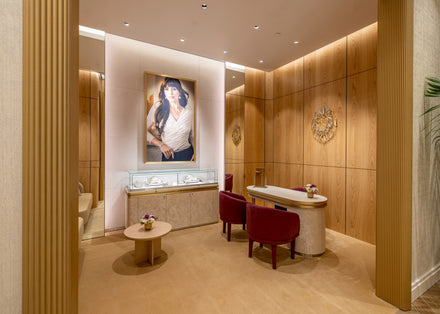 Located alongside the fabulous Watches of Switzerland showroom inside the Hudson Yards Mall, a premier destination for shopping, dining and culture on Manhattan's west side, this Roberto Coin boutique is one of three freestanding locations in the U.S.. Boasting of a sleek contemporary design with sumptuous wall coverings, a striking Murano glass chandelier, ruby-upholstered furnishings and a VIP room in the brand's signature colors to preserve the DNA and essence of the Venetian designer, every detail in this 1000-square-foot space is crafted to captivate clients with stunning pieces and deliver unparalleled elegance.